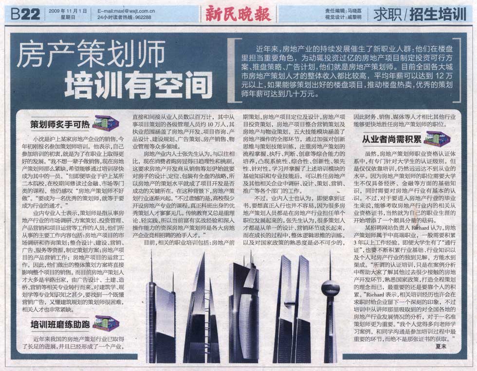 4、解决社会就业问题。受全国多家房地产支持单位委托,定向培训房地产策划专业人员,定向解决就业、择业问题。